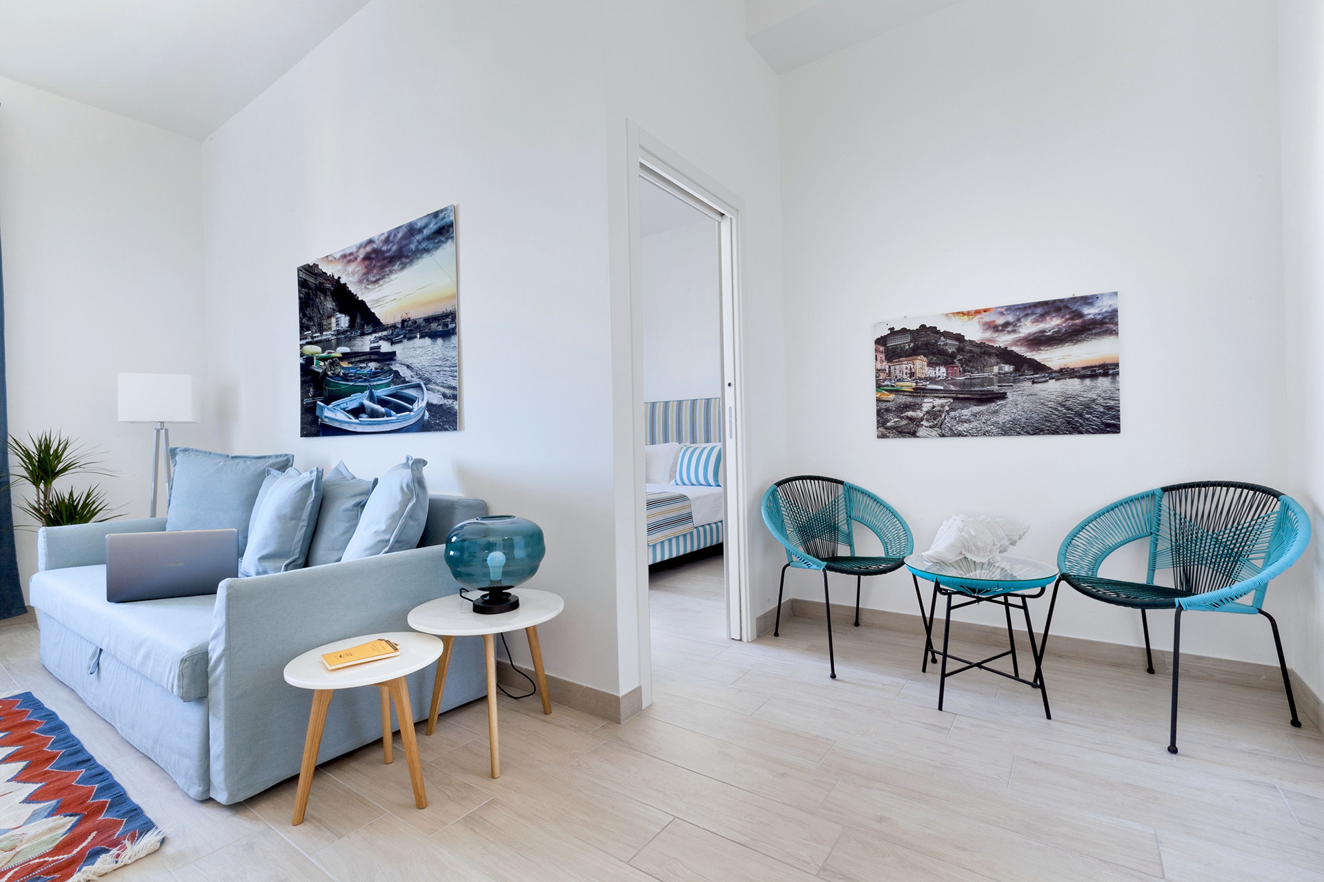 L’appartamento presenta un ampio soggiorno luminoso con divano letto matrimoniale, TV a schermo piatto, cassettiera, tavolo per 4 e finestra vista mare: perfetto per trascorrere momenti conviviali con i propri cari.