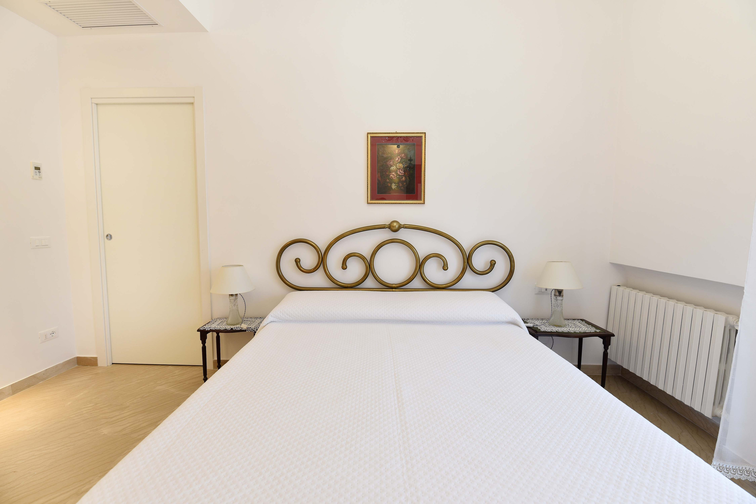 • Camera da letto principale: letto king size a baldacchino + 1 letto singolo, SMART TV, aria condizionata e finestra con vista sul cortile interno. Il bagno privato, elegantemente suddiviso, separa l’area WC/bidet/lavandino dalla cabina doccia in vetro.