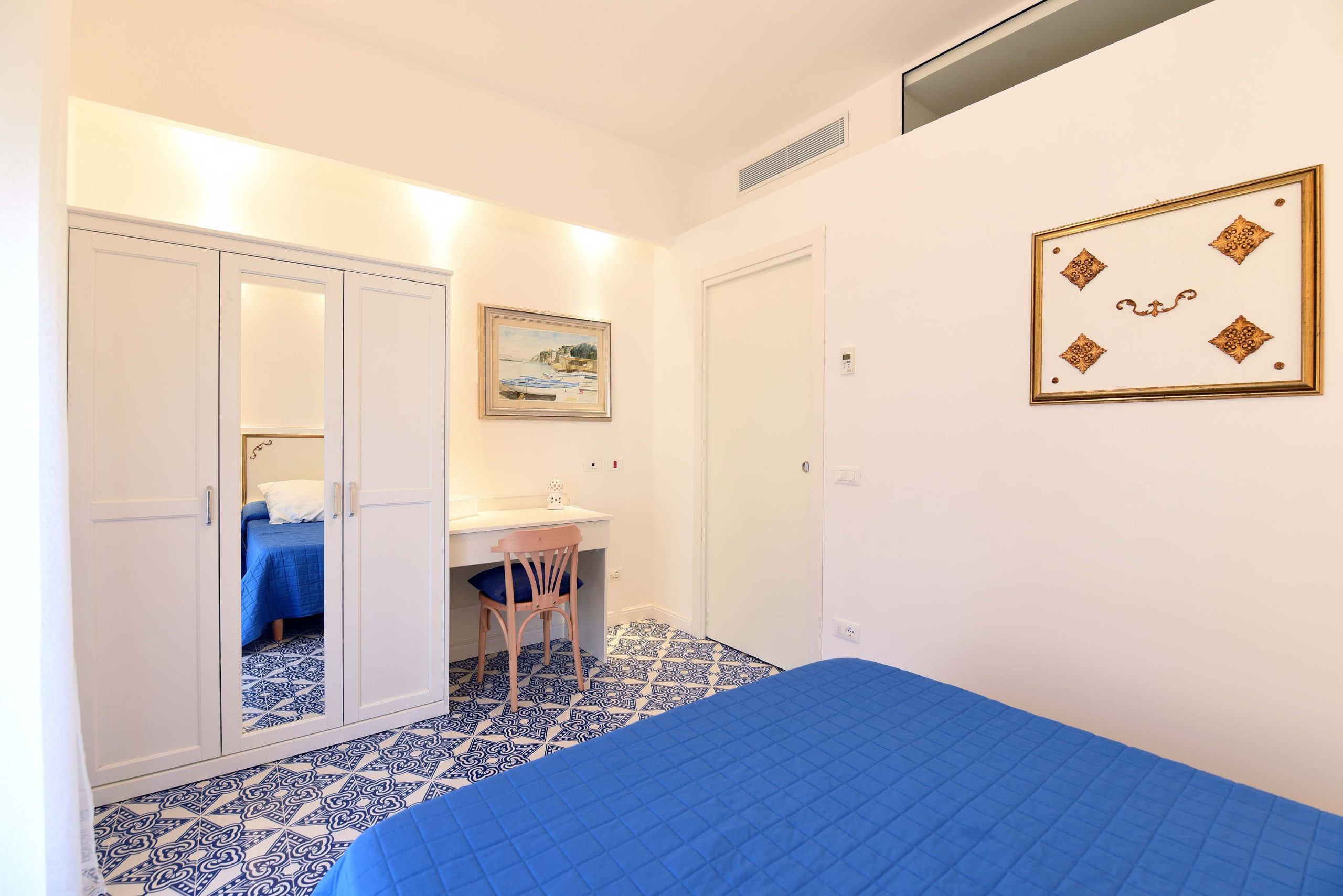 • Soggiorno / Seconda zona notte: dotato di due letti singoli e un divano letto matrimoniale, SMART TV e aria condizionata. Da qui si accede a un piccolo balconcino dotato di tavolino e sedie: il luogo perfetto per gustare un caffè o un aperitivo ammirando l’incomparabile panorama sul mare e sul Vesuvio.