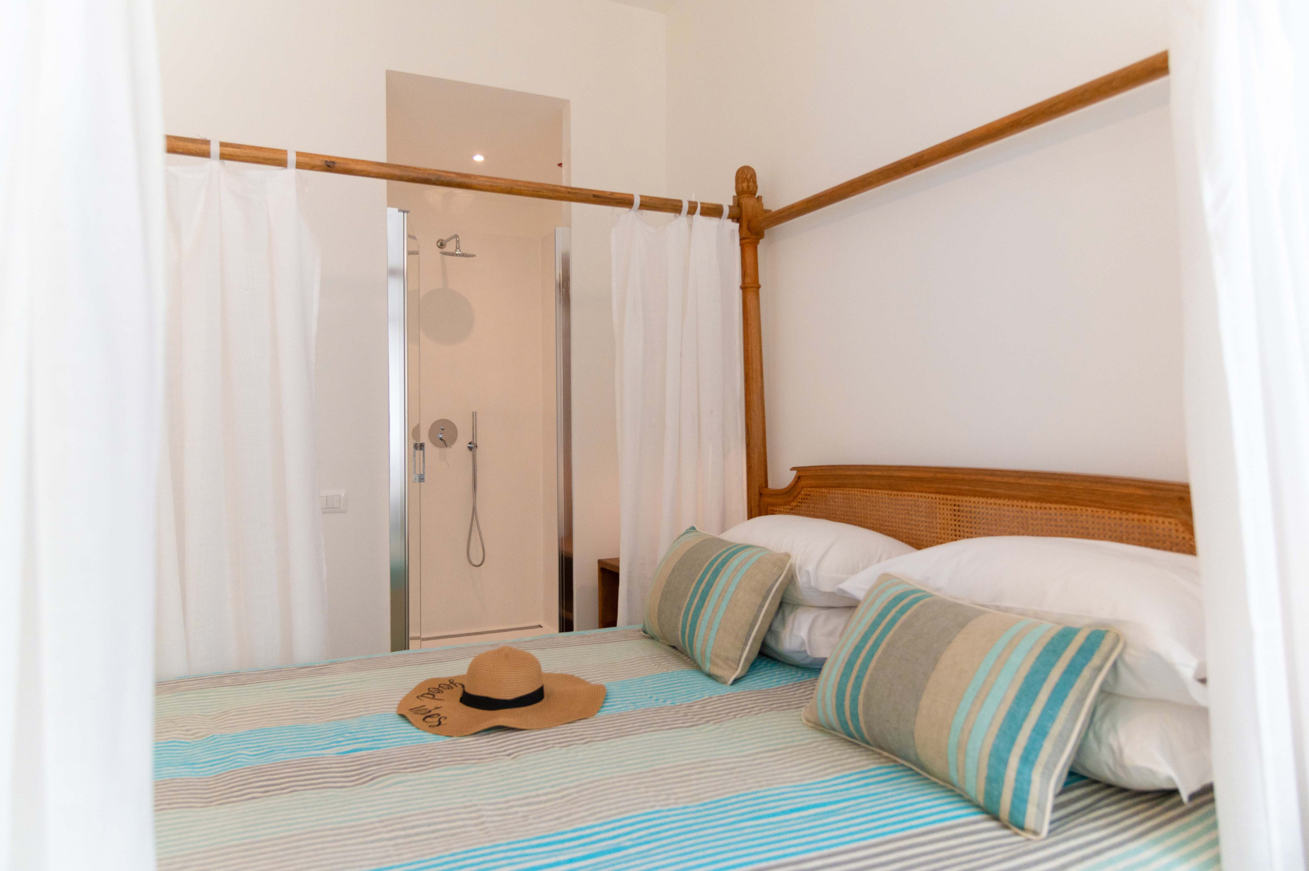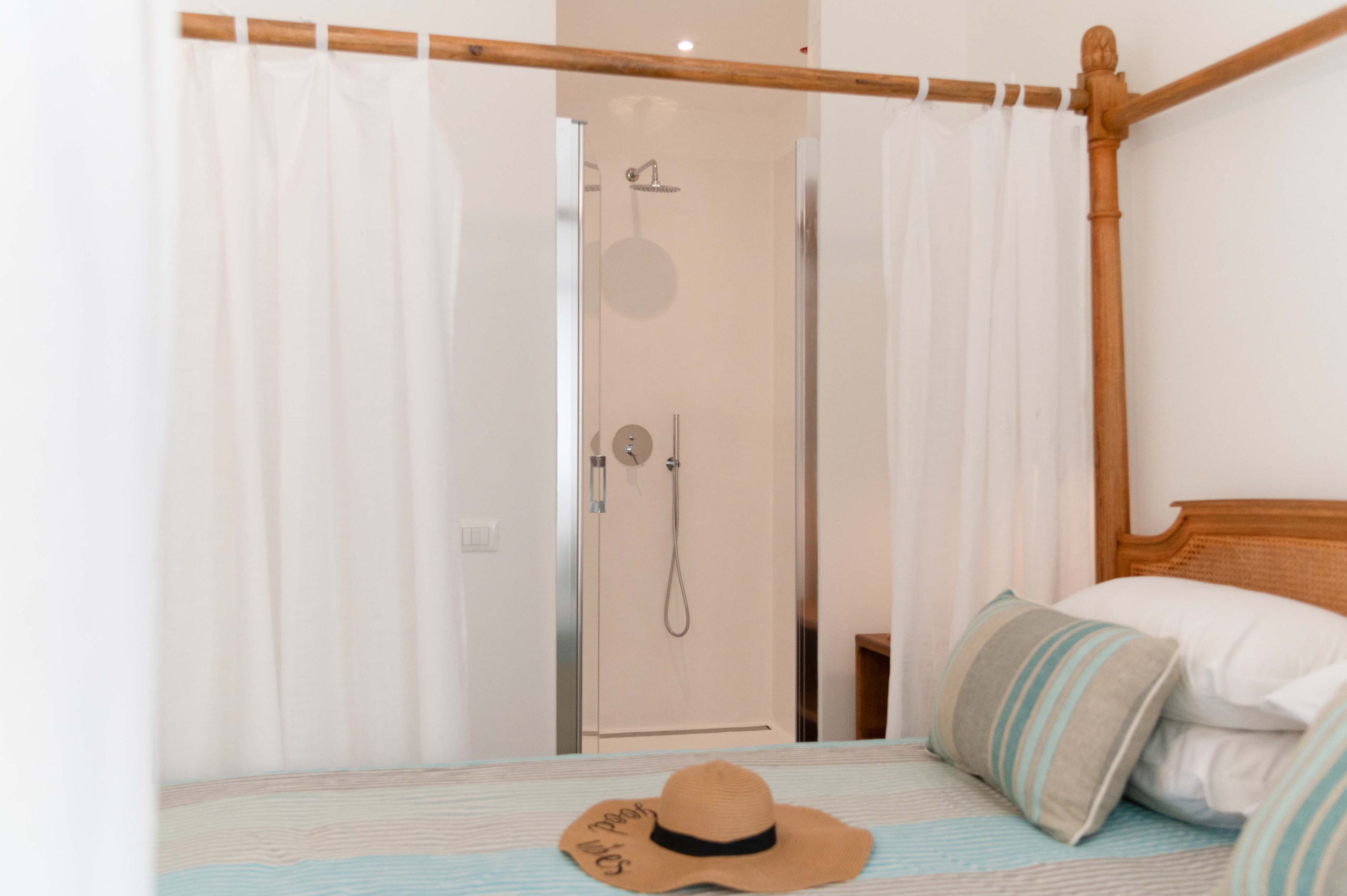 • Camera da letto principale: letto king size a baldacchino + 1 letto singolo, SMART TV, aria condizionata e finestra con vista sul cortile interno. Il bagno privato, elegantemente suddiviso, separa l’area WC/bidet/lavandino dalla cabina doccia in vetro.