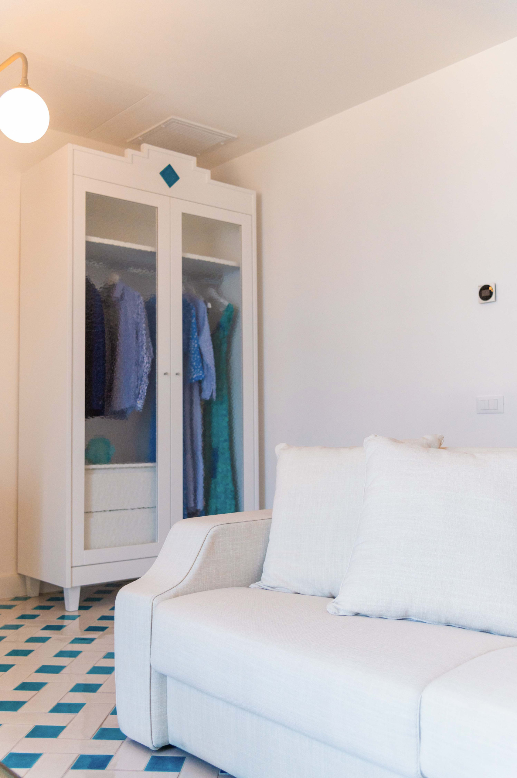 • Soggiorno / Seconda zona notte: dotato di due letti singoli e un divano letto matrimoniale, SMART TV e aria condizionata. Da qui si accede a un piccolo balconcino dotato di tavolino e sedie: il luogo perfetto per gustare un caffè o un aperitivo ammirando l’incomparabile panorama sul mare e sul Vesuvio.