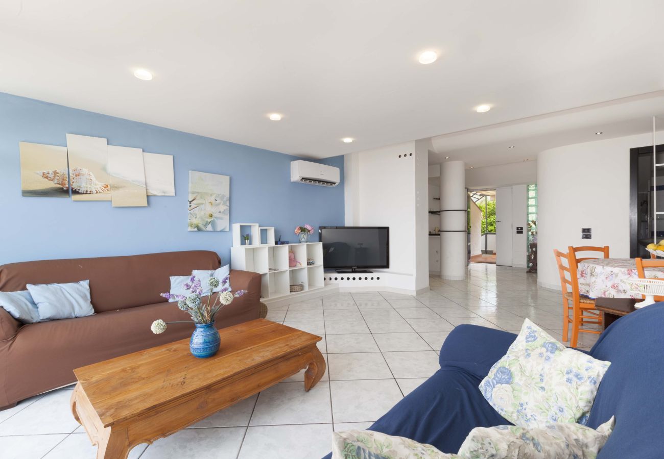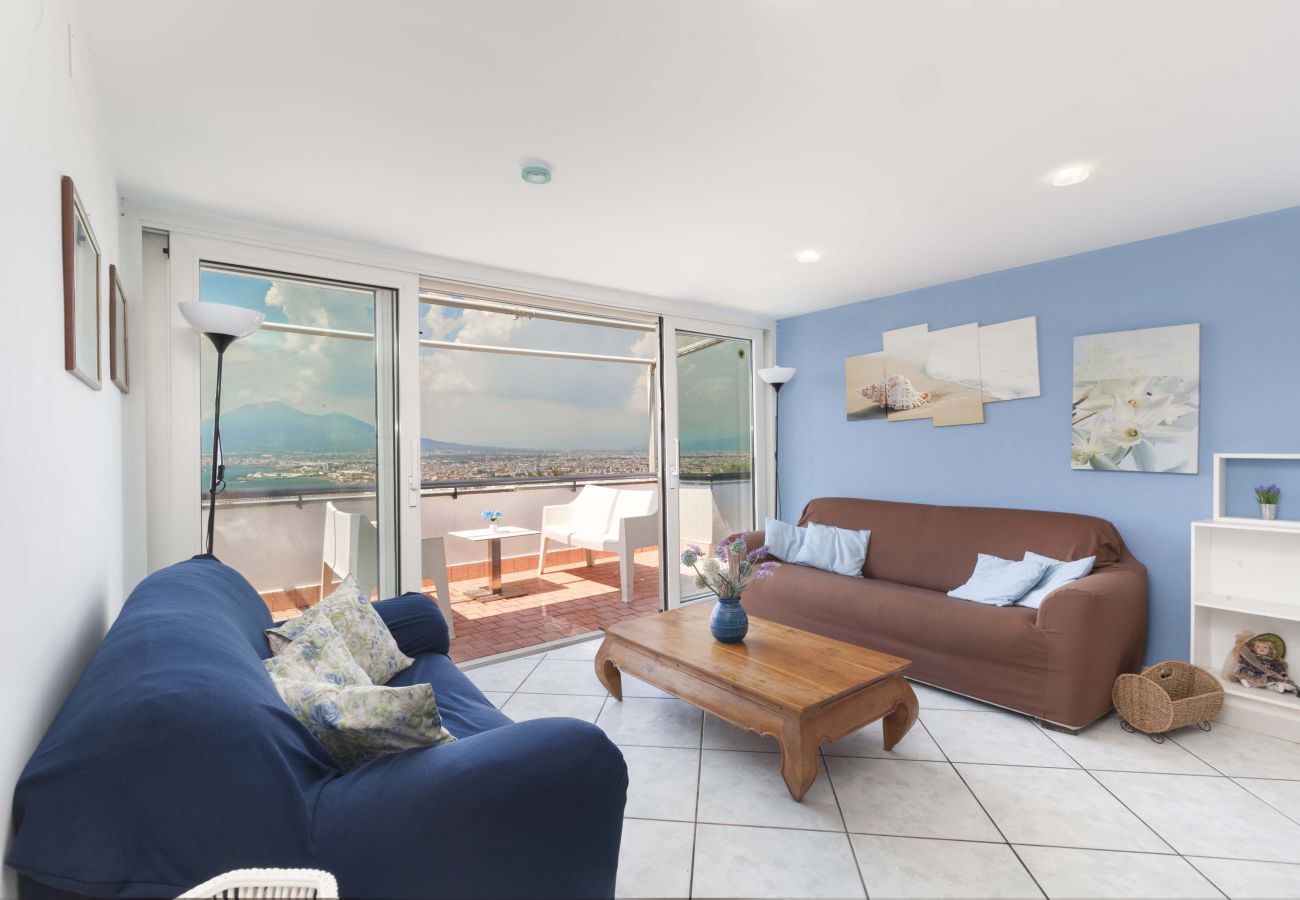 Arredata con semplicità e con ambienti ben proporzionati, la villa ha un ampio salone al pianterreno, con divano letto e portefinestre su una terrazza con vista sul mare e sul Vesuvio. Una scala porta dal salone al piano inferiore dove c’è una cucina (con tavolo da cucina) da cui si può accedere sia al giardino che alla sala da pranzo con tavolo per 14.