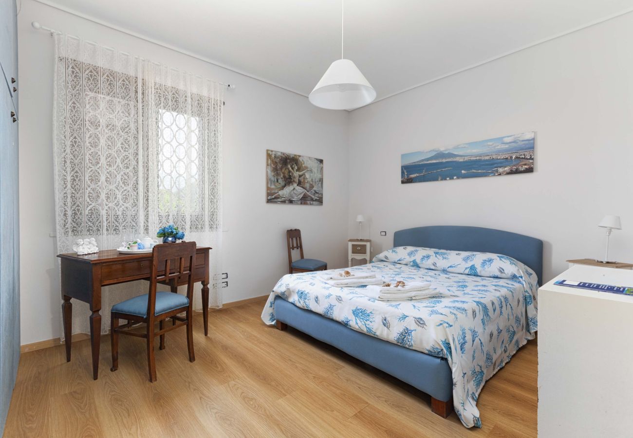 • Camera da letto 3 con bagno privato: 2 letti singoli, TV, A/C e riscaldamento, minifrigo, finestra sulla terrazza con vista sul mare e sul Vesuvio. Accesso dal corridoio.