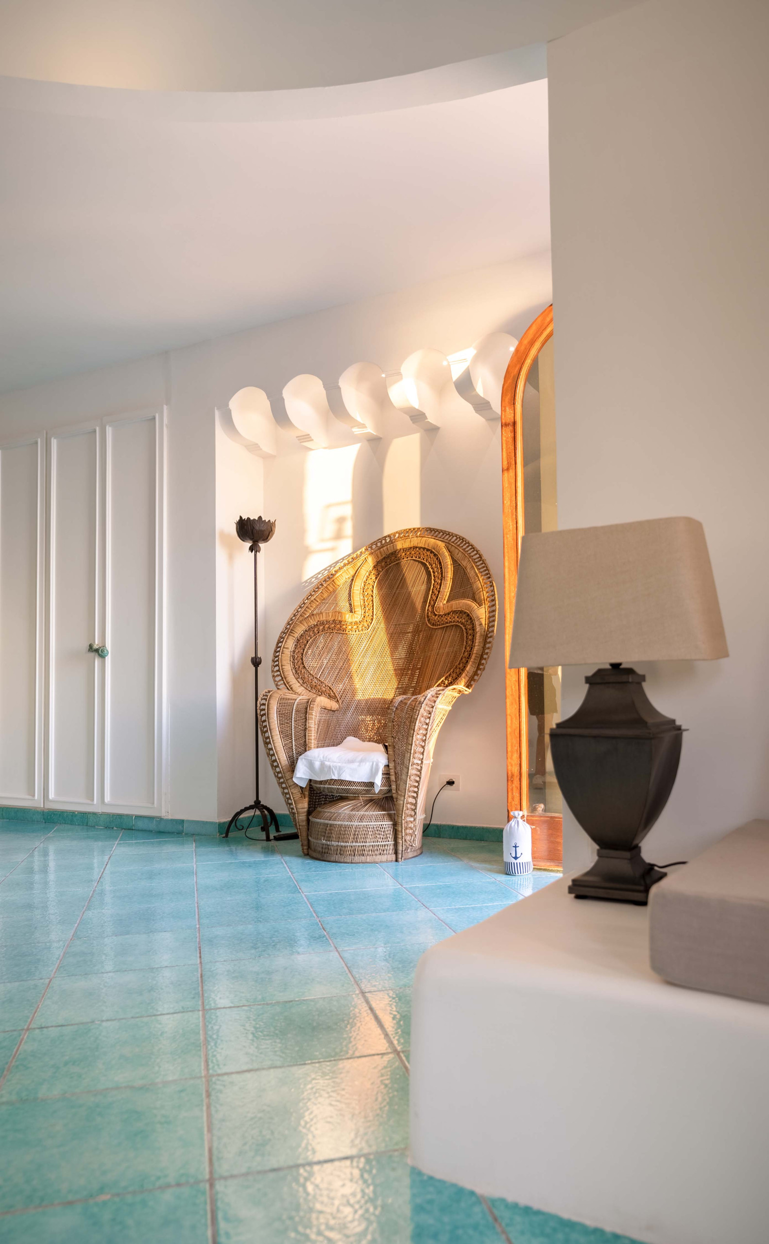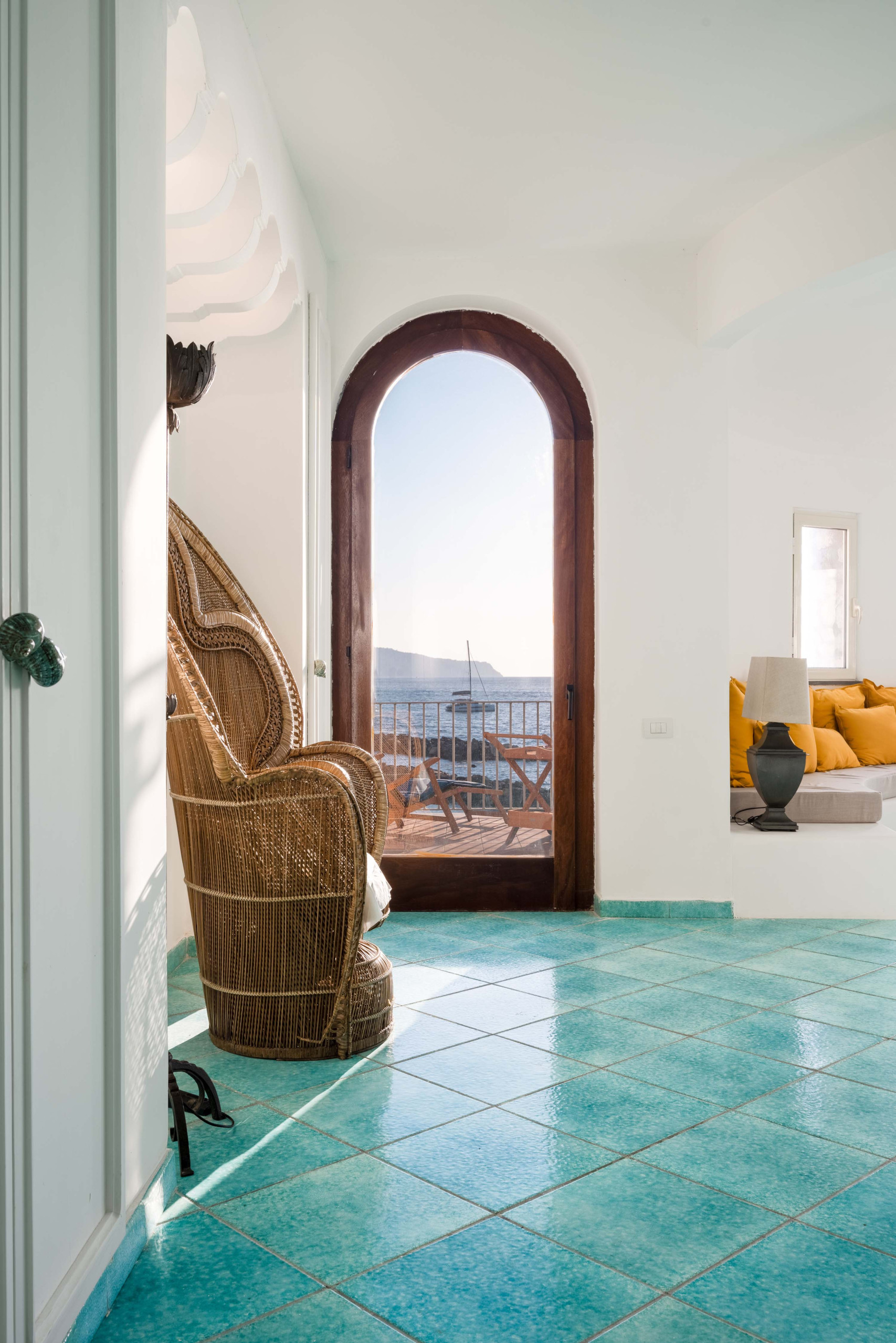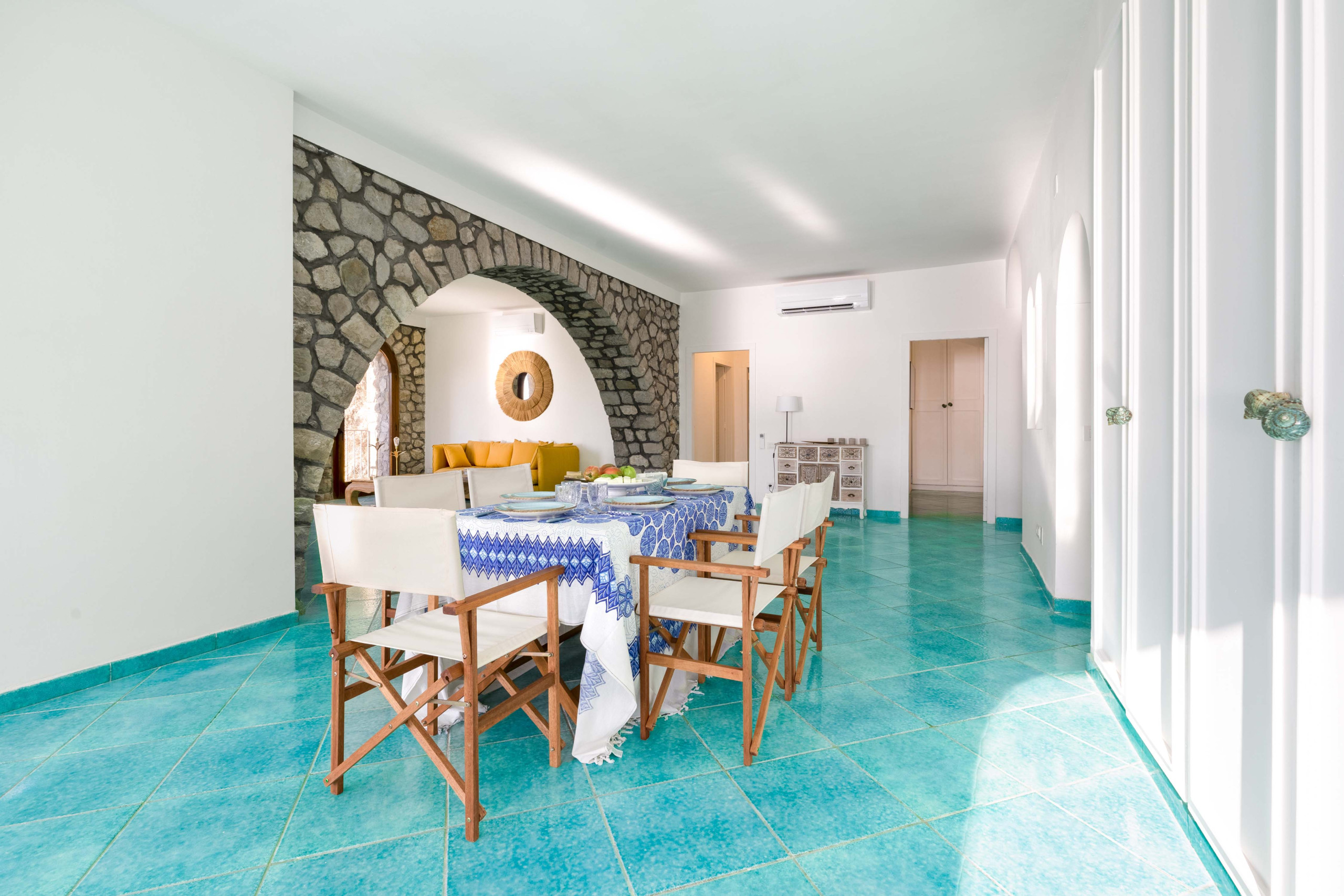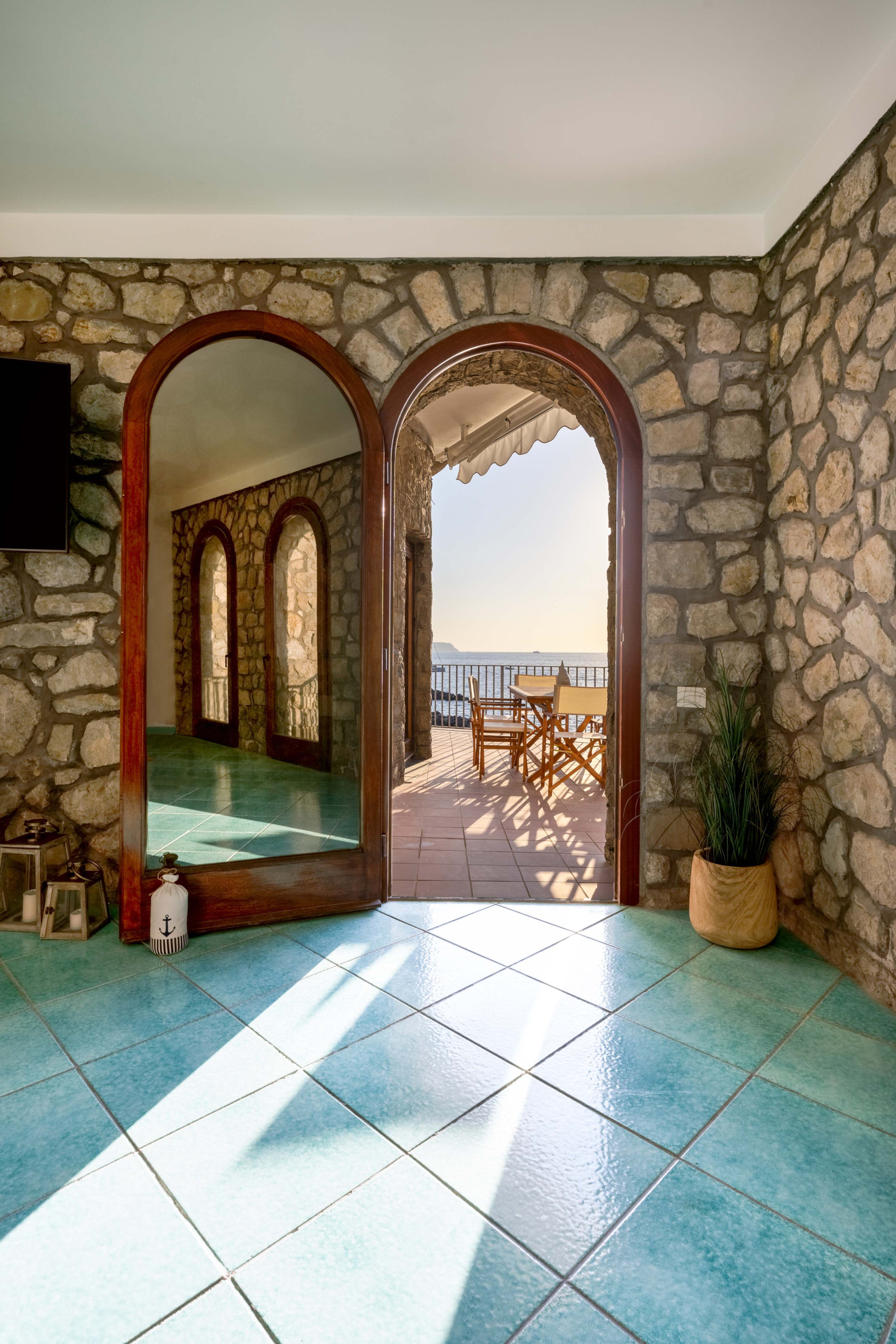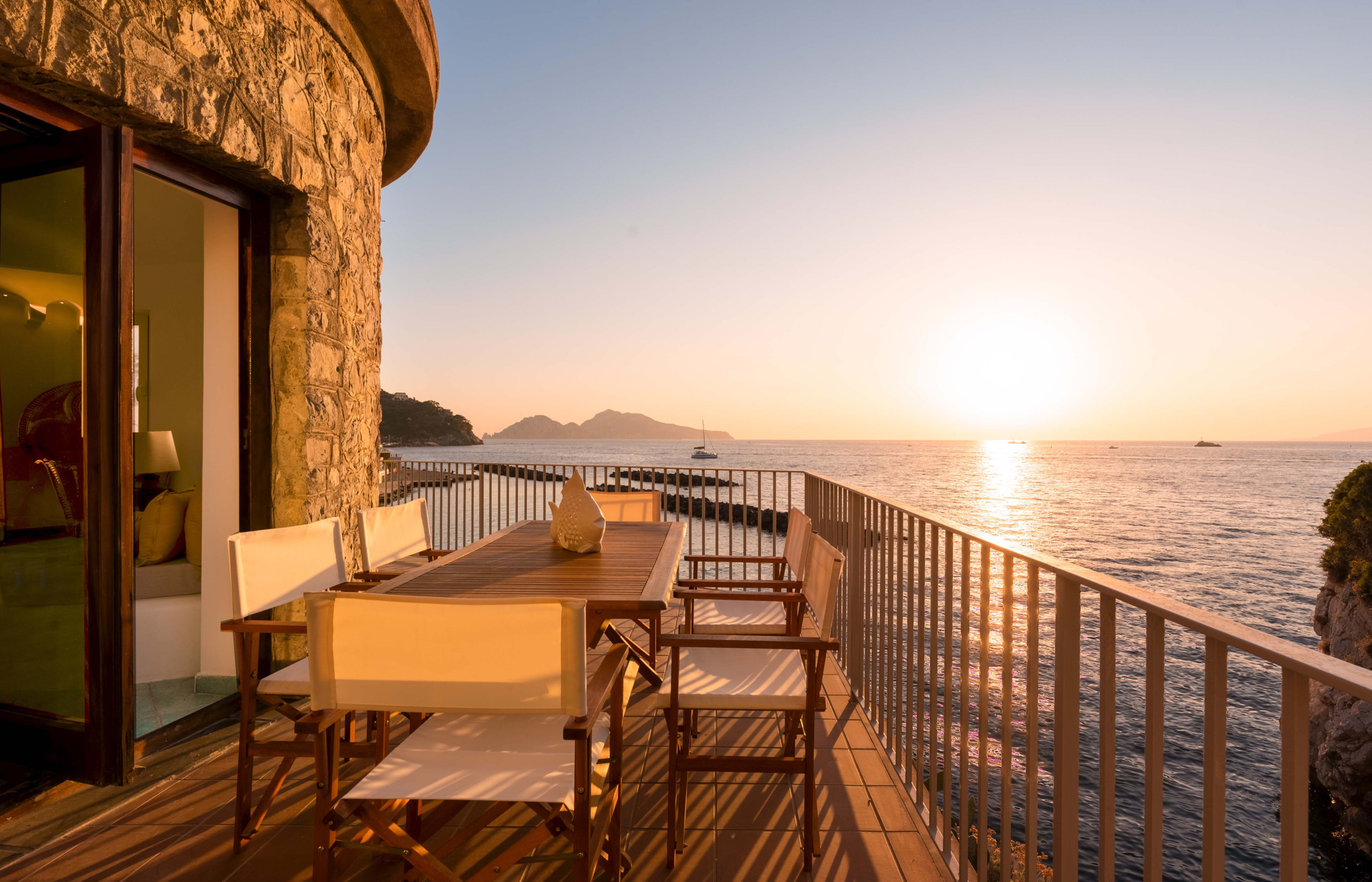 Il vero fiore all’occhiello della proprietà è la splendida terrazza panoramica di forma circolare, un elemento architettonico che richiama l’anima stessa della torre. Qui troverete un tavolo da pranzo con sedie e lettini prendisole, perfetti per trascorrere lunghe giornate all’aria aperta. La vista è semplicemente mozzafiato: lo Scoglio del Vervece sembra quasi a portata di mano, mentre sullo sfondo si stagliano le sagome eleganti di Capri e Ischia, regalando tramonti indimenticabili e atmosfere cariche di fascino.