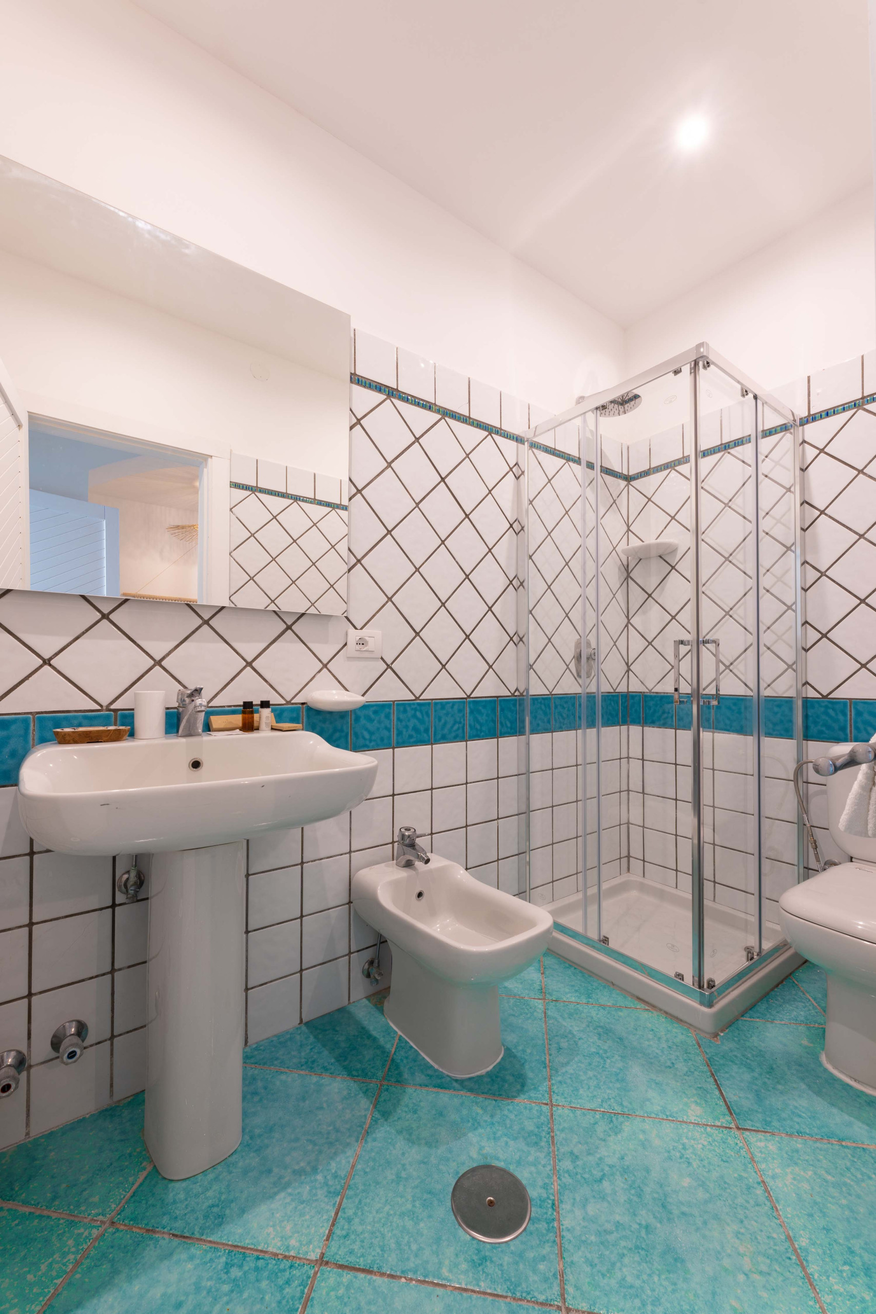 • Bagno 1 privato (Camera 1): Lavabo con grande specchio, wc, bidet, grande box doccia, termoarredo e asciugacapelli