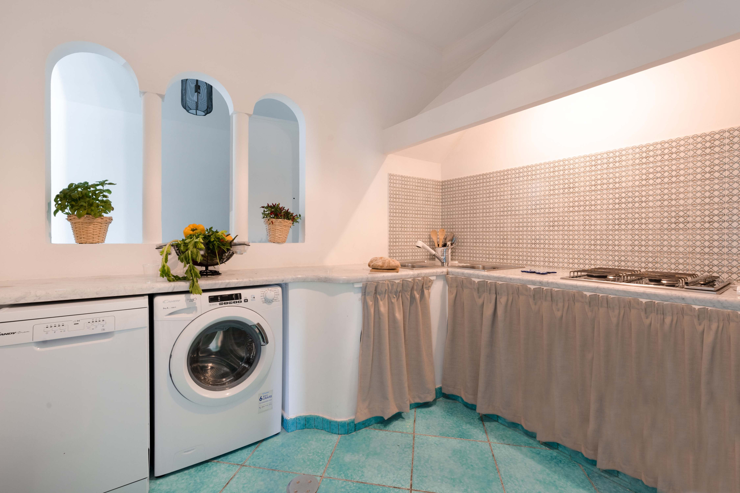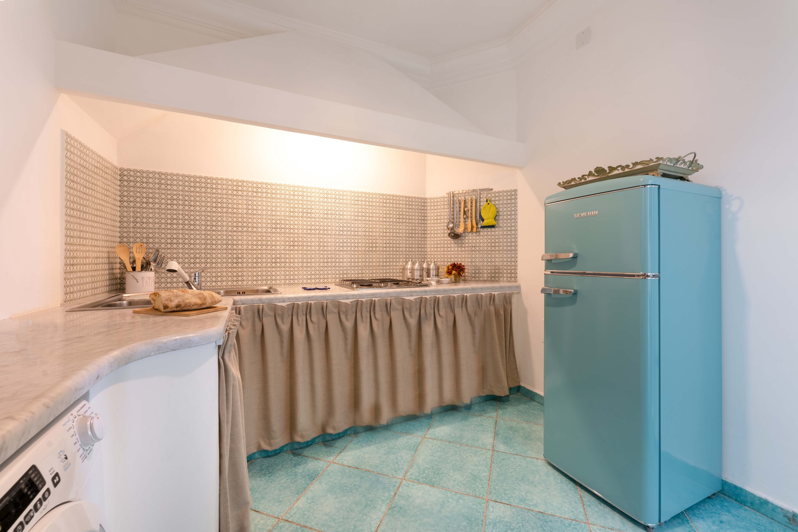 La cucina è indipendente e completamente attrezzata con fornelli a gas, forno, frigorifero, lavatrice, lavastoviglie, bollitore e macchina per caffè espresso. Uno spazio pratico e ben organizzato che consente di preparare comodamente colazioni, pranzi e cene da gustare all’interno o all’aperto.