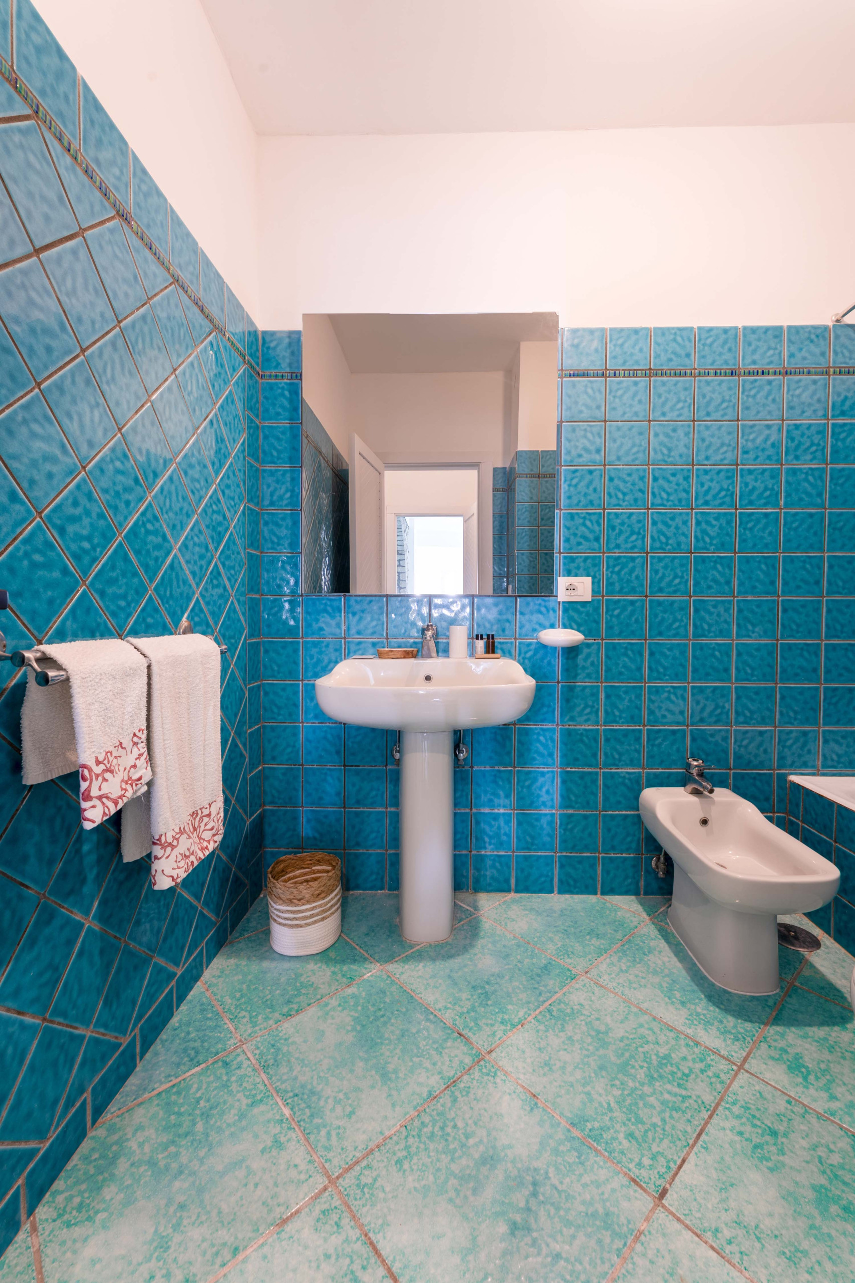 • Secondo bagno al piano con vasca, lavabo, WC e bidet, finestra con vista mare.