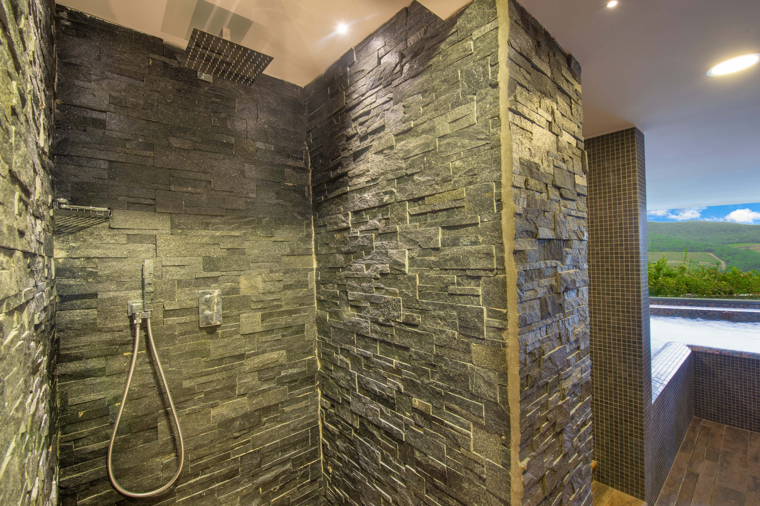 Una breve scala conduce al piano inferiore dove si trova una piscina coperta riscaldata (riscaldamento incluso da maggio a ottobre, max 28°/29°C; negli altri mesi riscaldamento su richiesta, a pagamento) con luci rilassanti, un piccolo bar e un'area lounge. Sullo stesso livello si trova anche una camera matrimoniale con bagno privato con doccia e accesso al giardino.