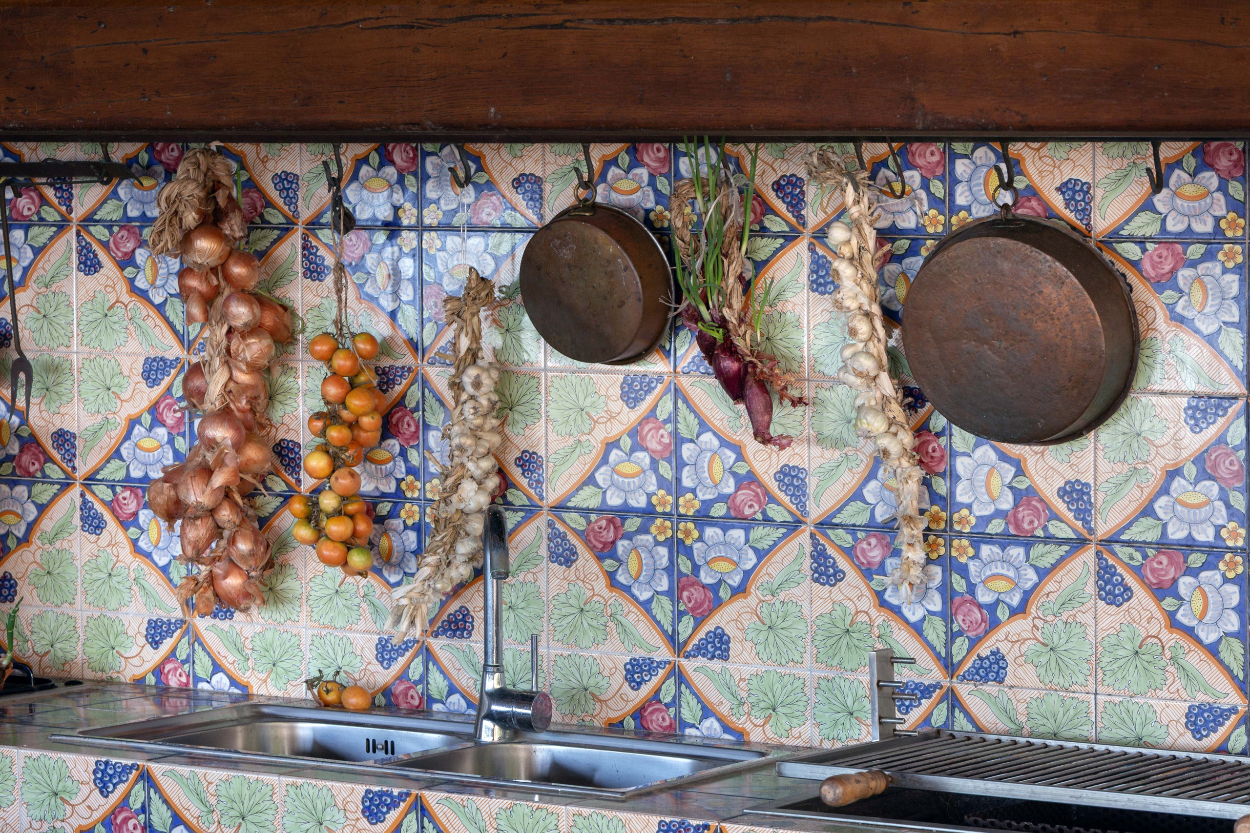 Dal lato opposto della piscina, salendo 18 gradini, si raggiunge la villa principale e il suo grande terrazzo privato panoramico, in parte ombreggiato da una copertura in bambù: un vero e proprio salotto all’aperto che in estate diventa il cuore della casa. Qui vi aspetta una cucina esterna completa, perfetta per pranzi e cene tutti insieme, grigliate al tramonto e momenti conviviali da vivere senza fretta. È anche lo spazio ideale per organizzare cooking class ed esperienze gastronomiche in villa, grazie all’ampia area di lavoro e al grande tavolo dove ritrovarsi.