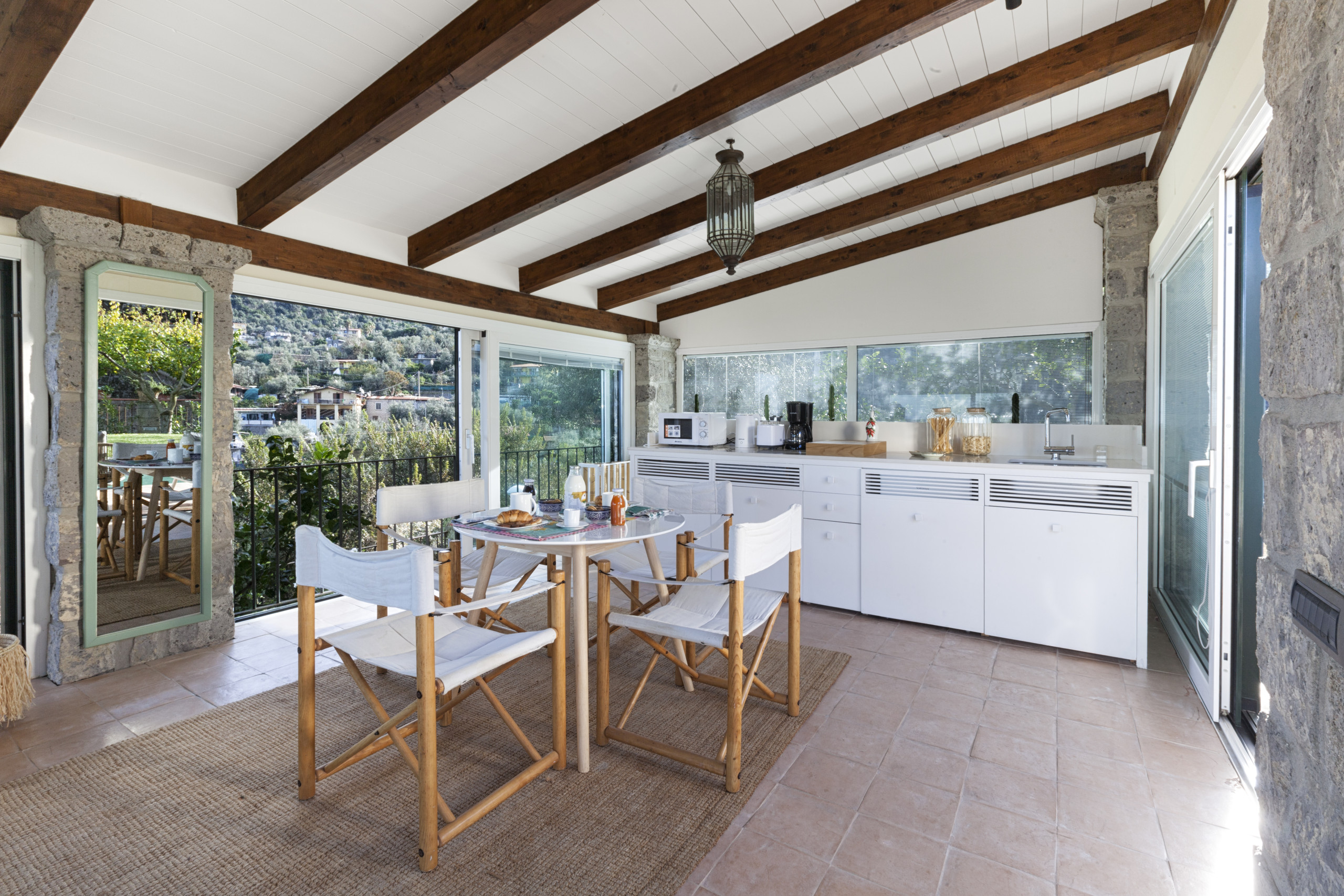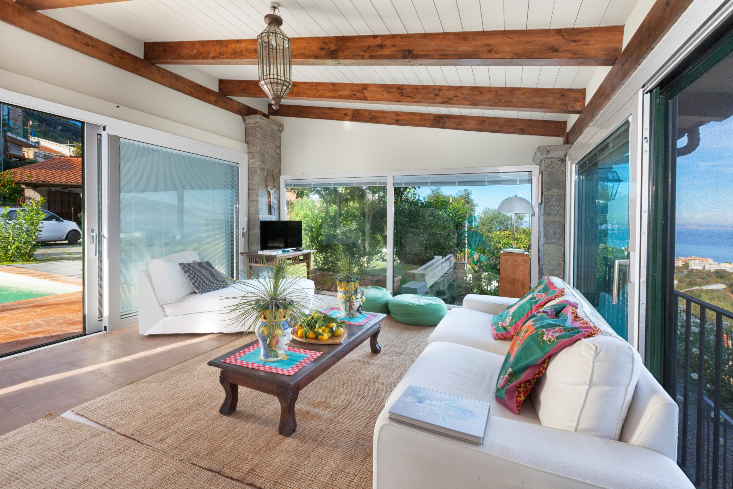 Accanto alla piscina si trova una veranda chiusa con grandi vetrate panoramiche, arredata con divano, chaise longue, tavolino e TV: uno spazio ideale per rilassarsi all’ombra, con vista mare e Vesuvio, tra un bagno e l’altro.