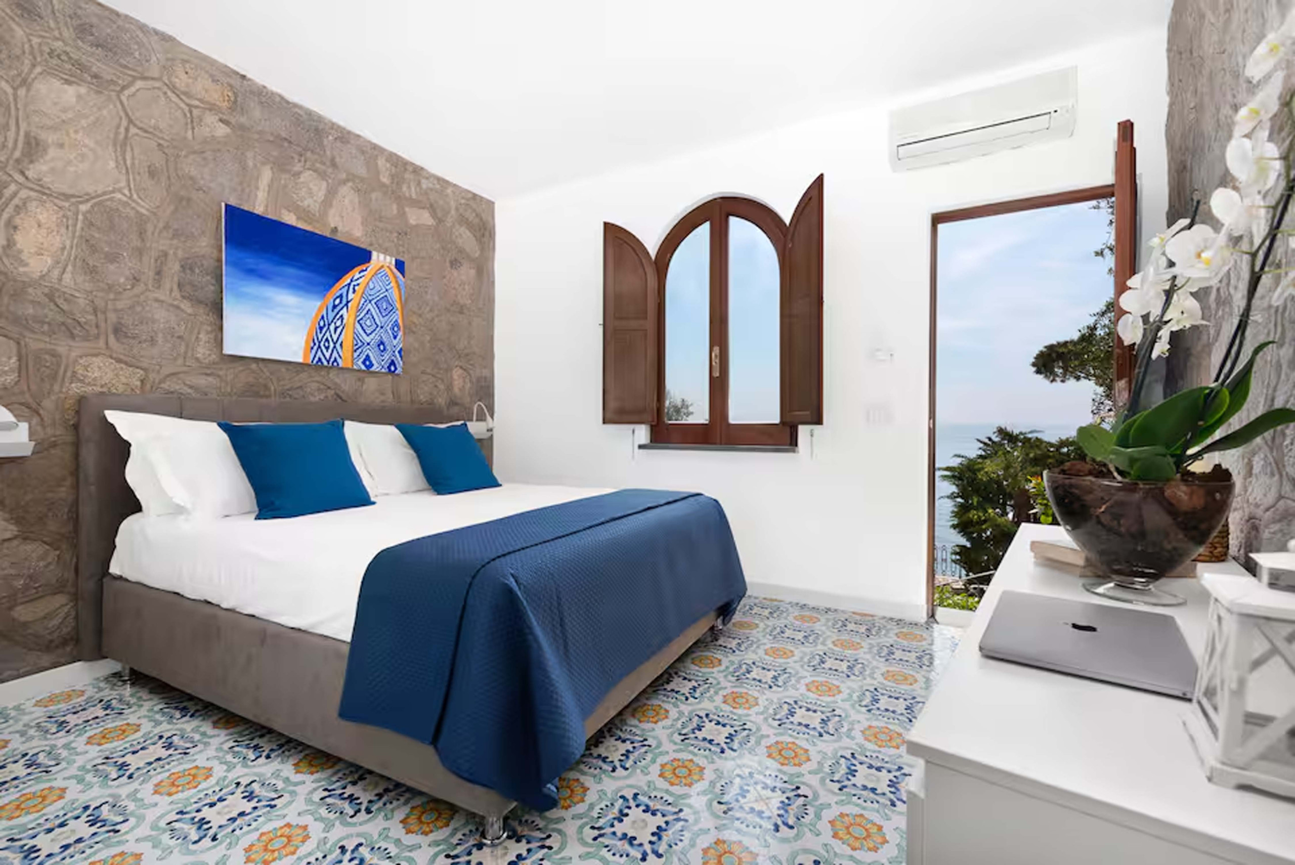 • Bedroom (accessible via a short external staircase): queen-size bed, sea-view window, TV, air conditioning