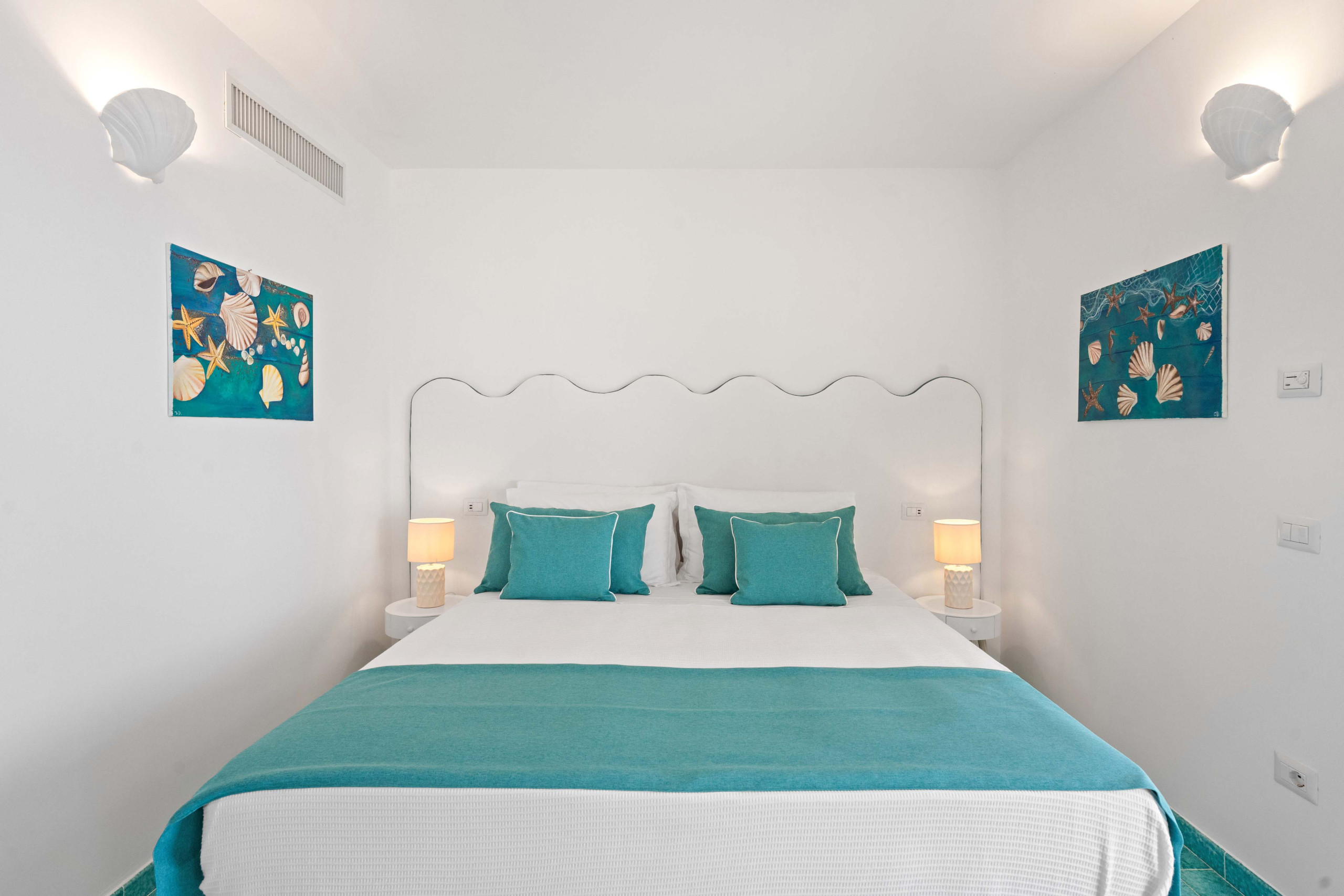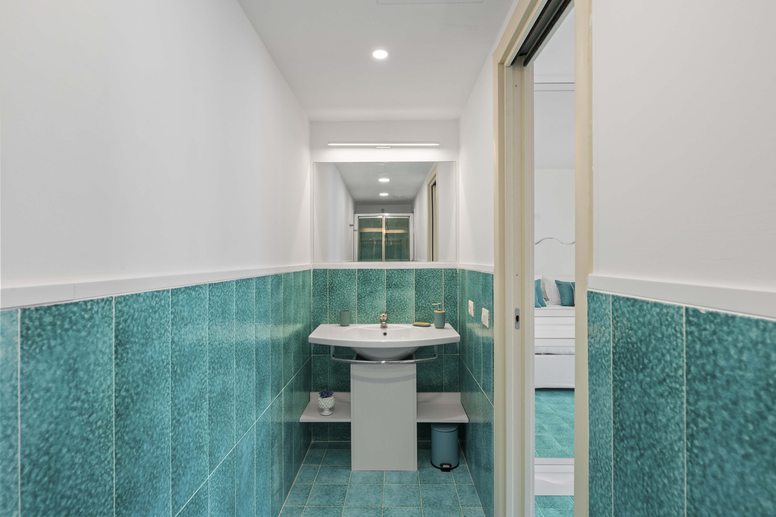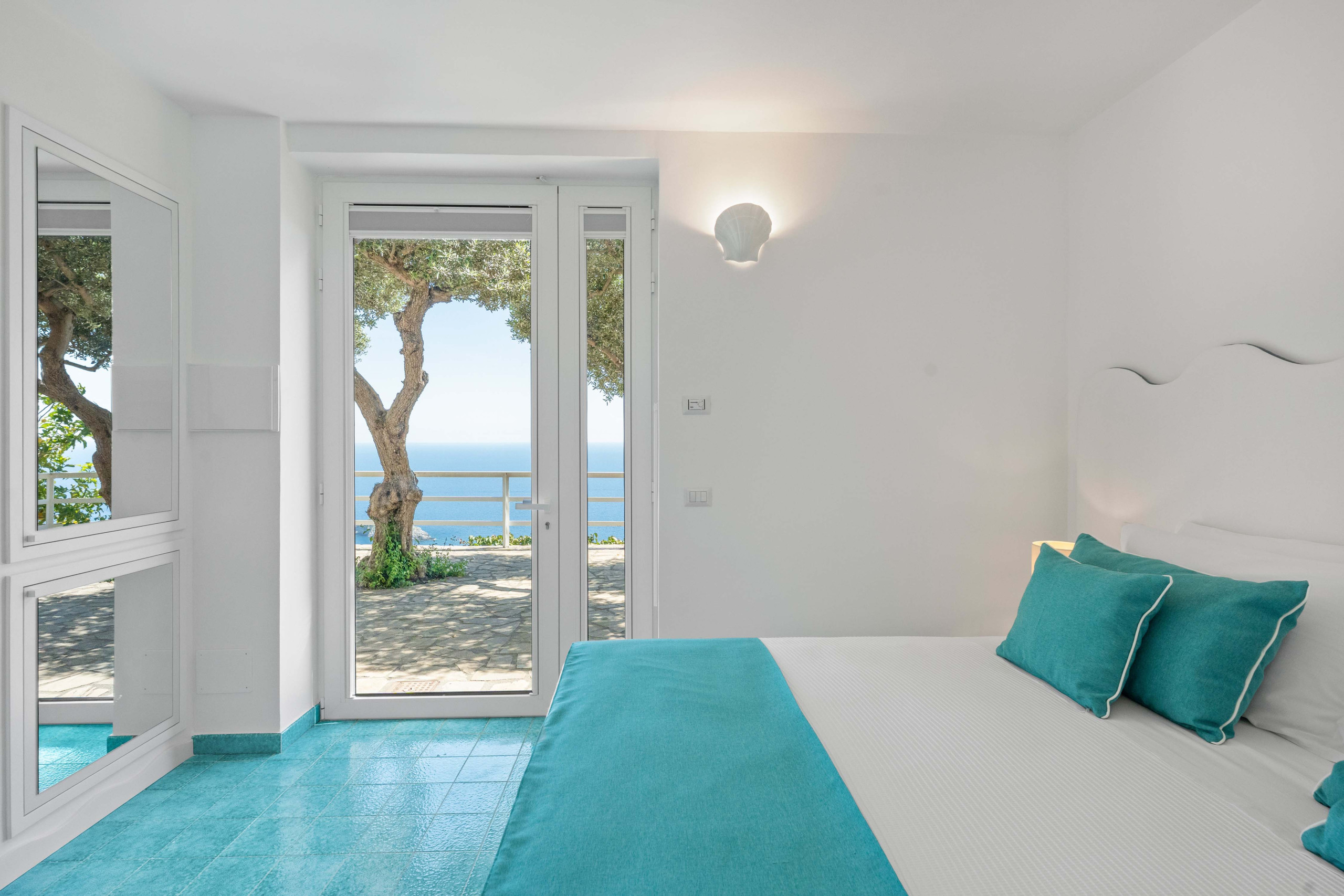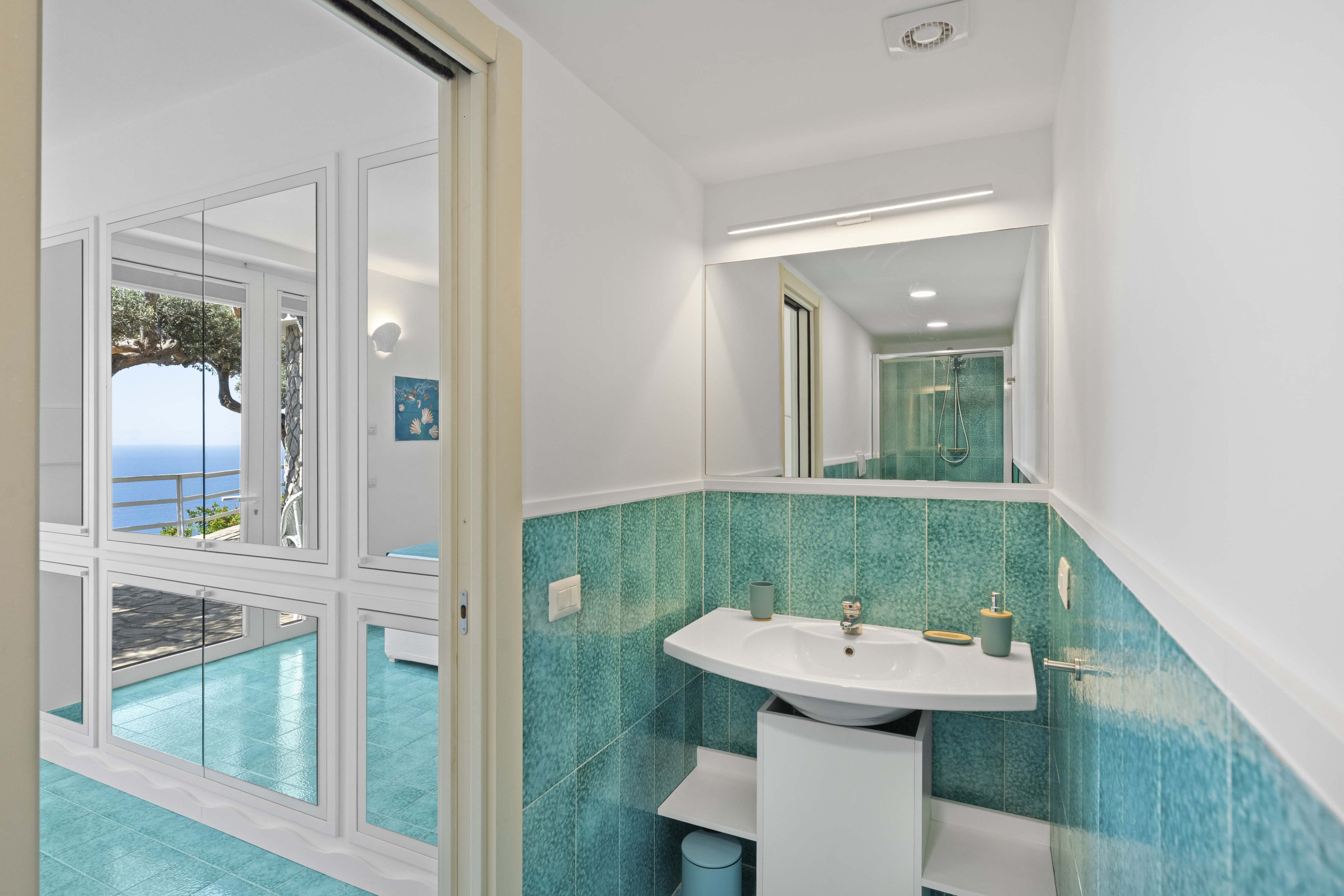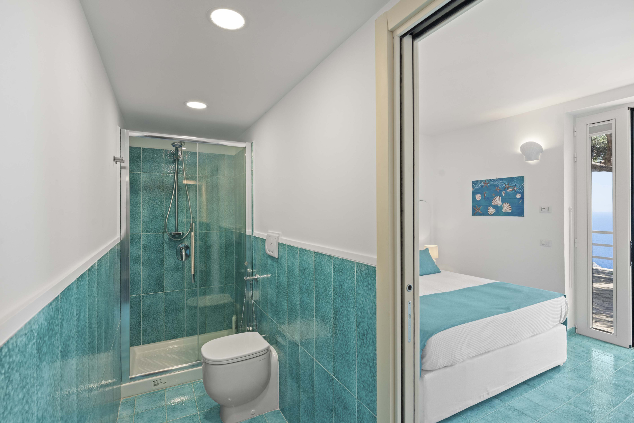 • Bedroom 4: queen-size bed, access to sea-view terrace, ensuite bathroom (with shower, sink, toilet, hairdryer), SMART TV, mini fridge, kettle
