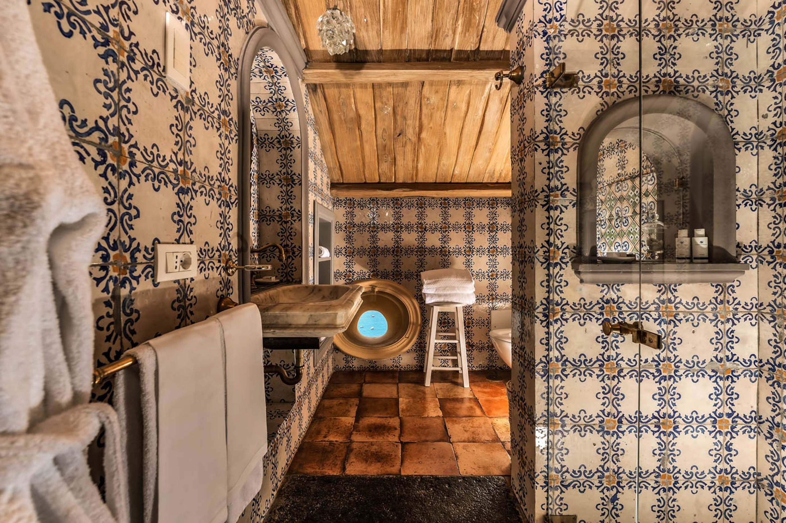 When reaching the ground floor, you will find, immediately to your left, a beautiful Turkish antique tiled bathtub, a terracotta tiled floor and a Finnish Sauna for 2. Two showers identified by a lovely marble face sculpture from which the water exits, encircled by antique mosaic tiles dating back to the 17th century, originating from the Neapolitan School of Giustiniani.