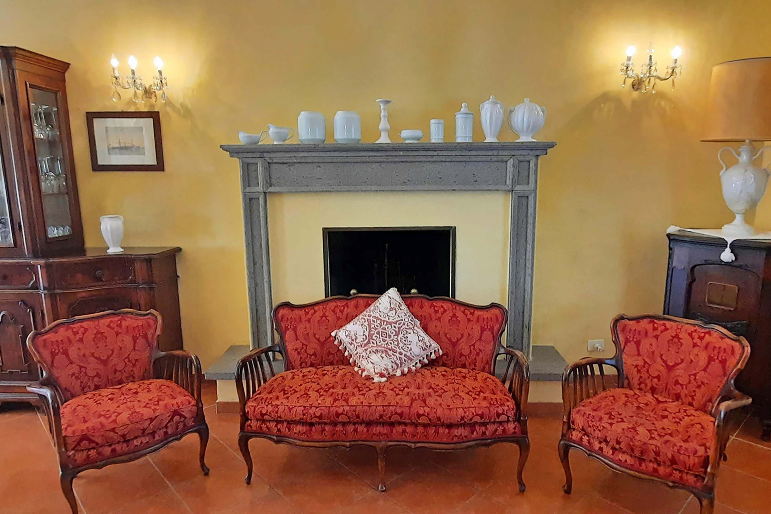 • Three spacious living rooms, two with pietra serena stone fireplaces, one with a piano, all opening onto the semi-circular panoramic terrace