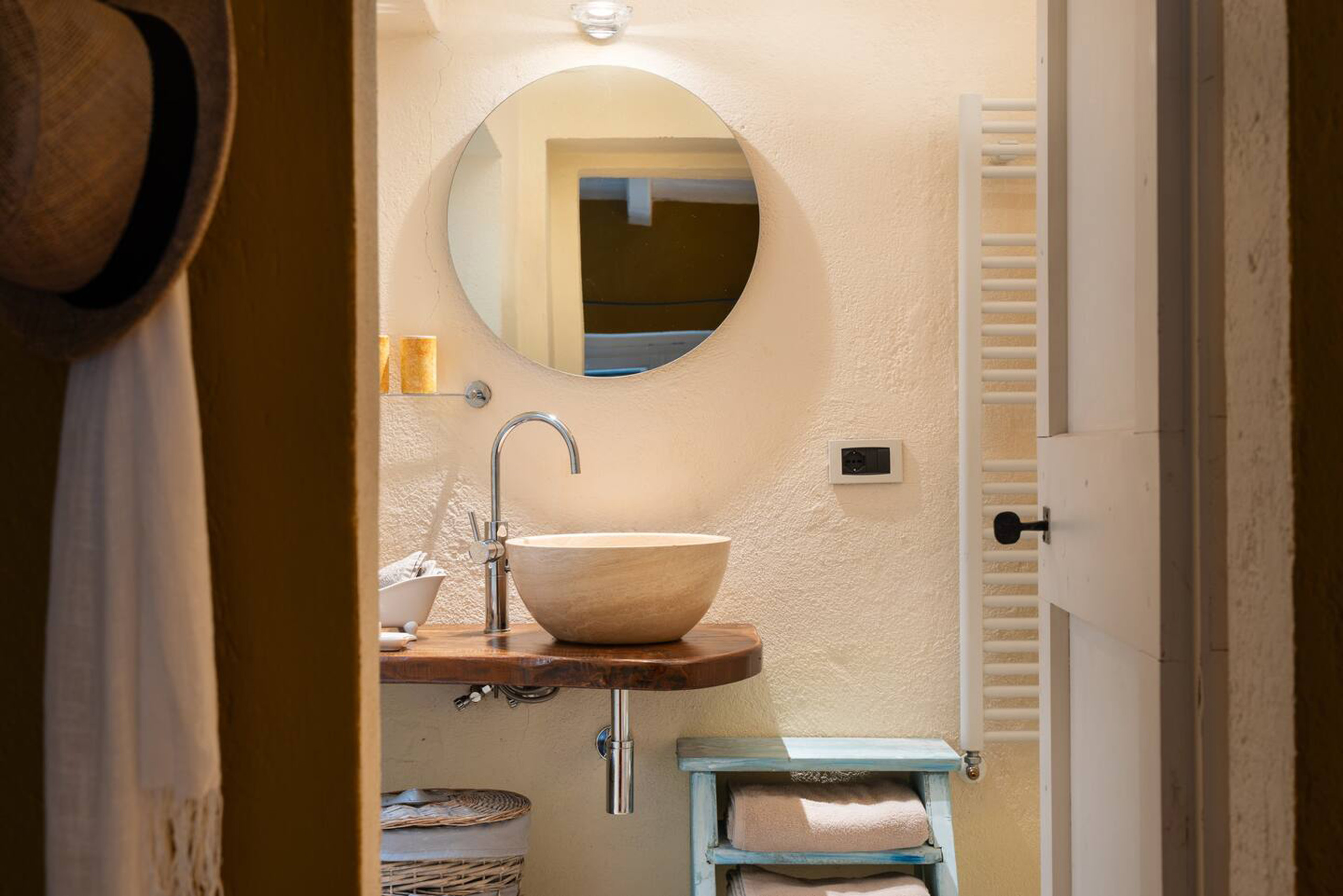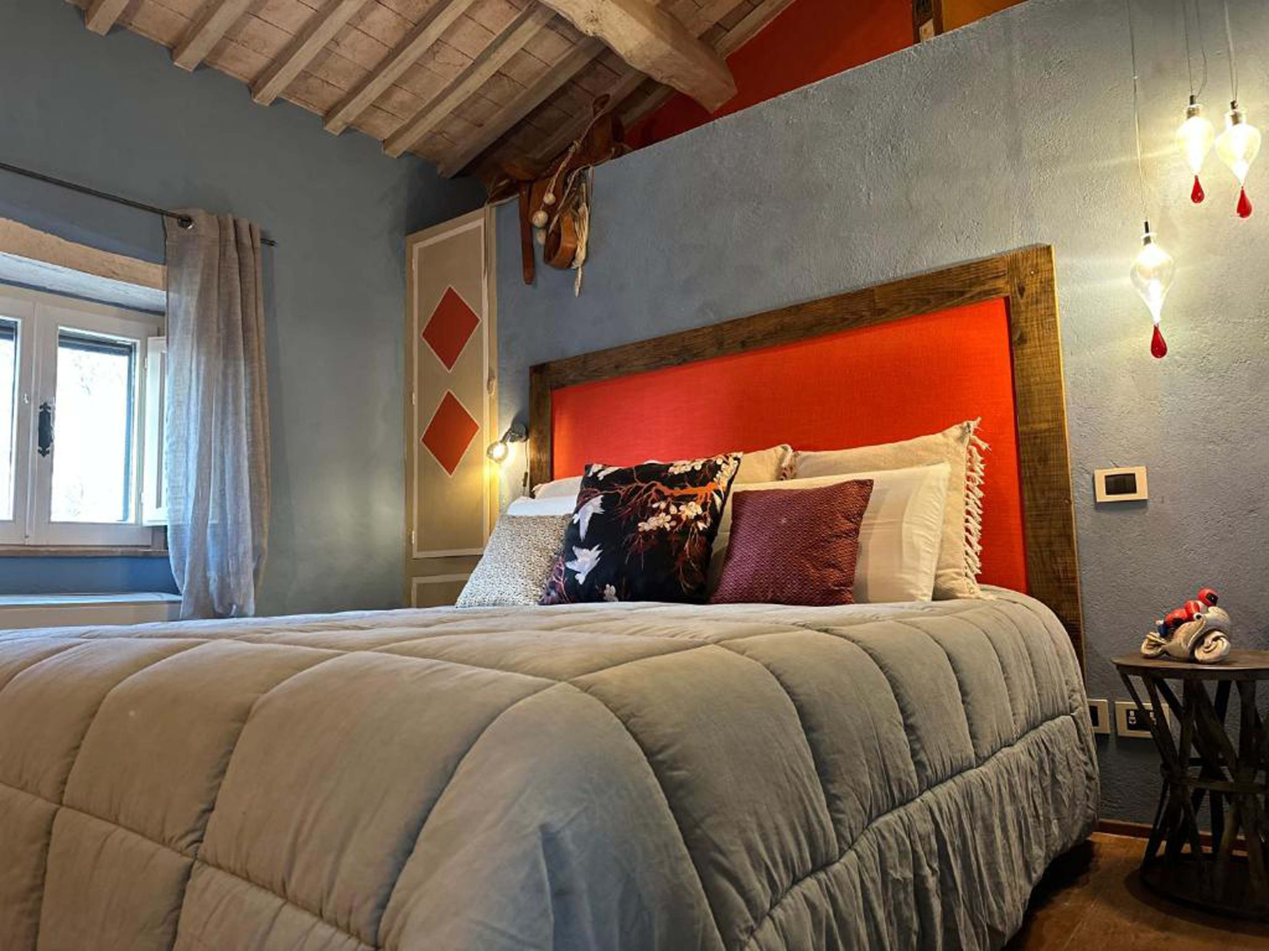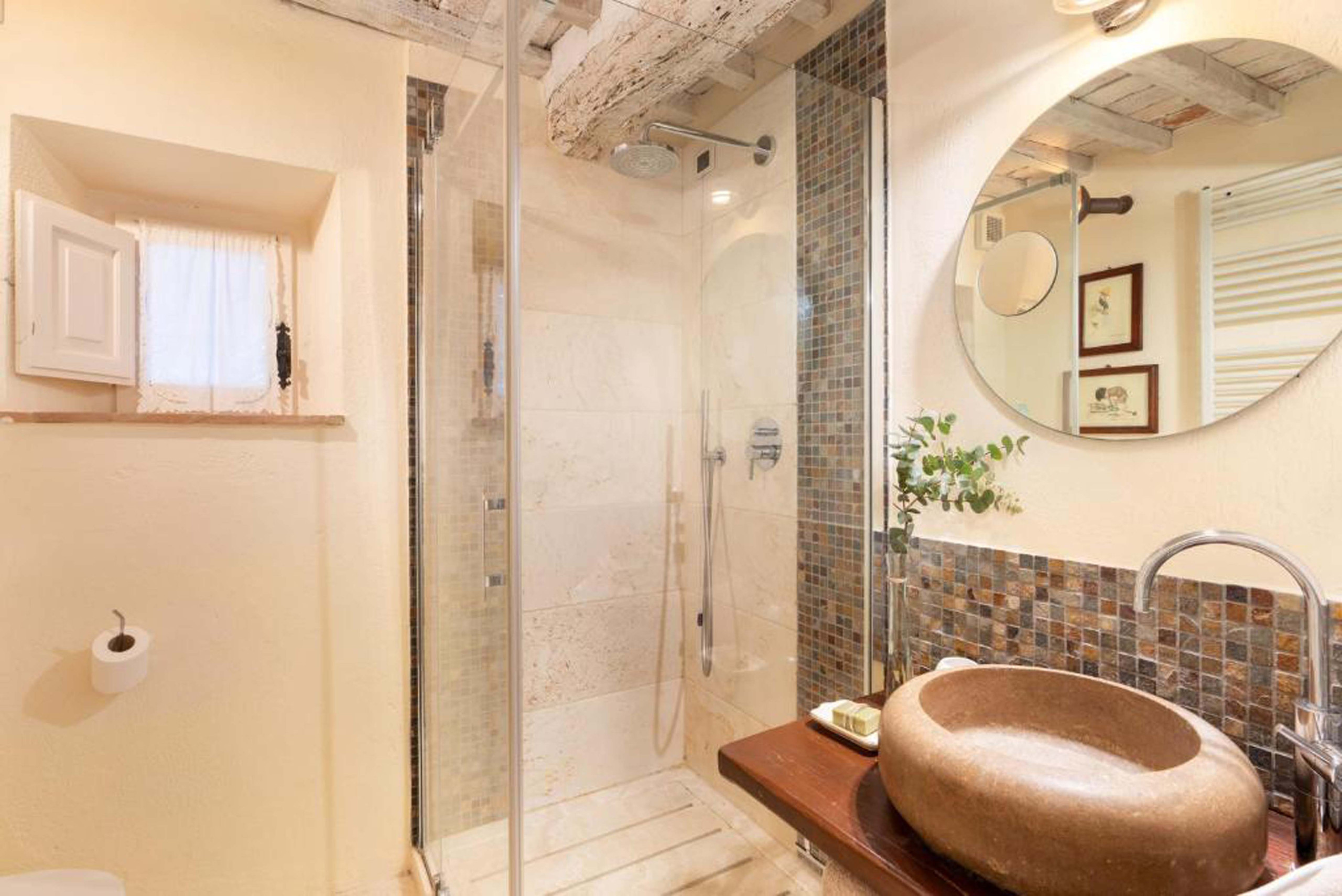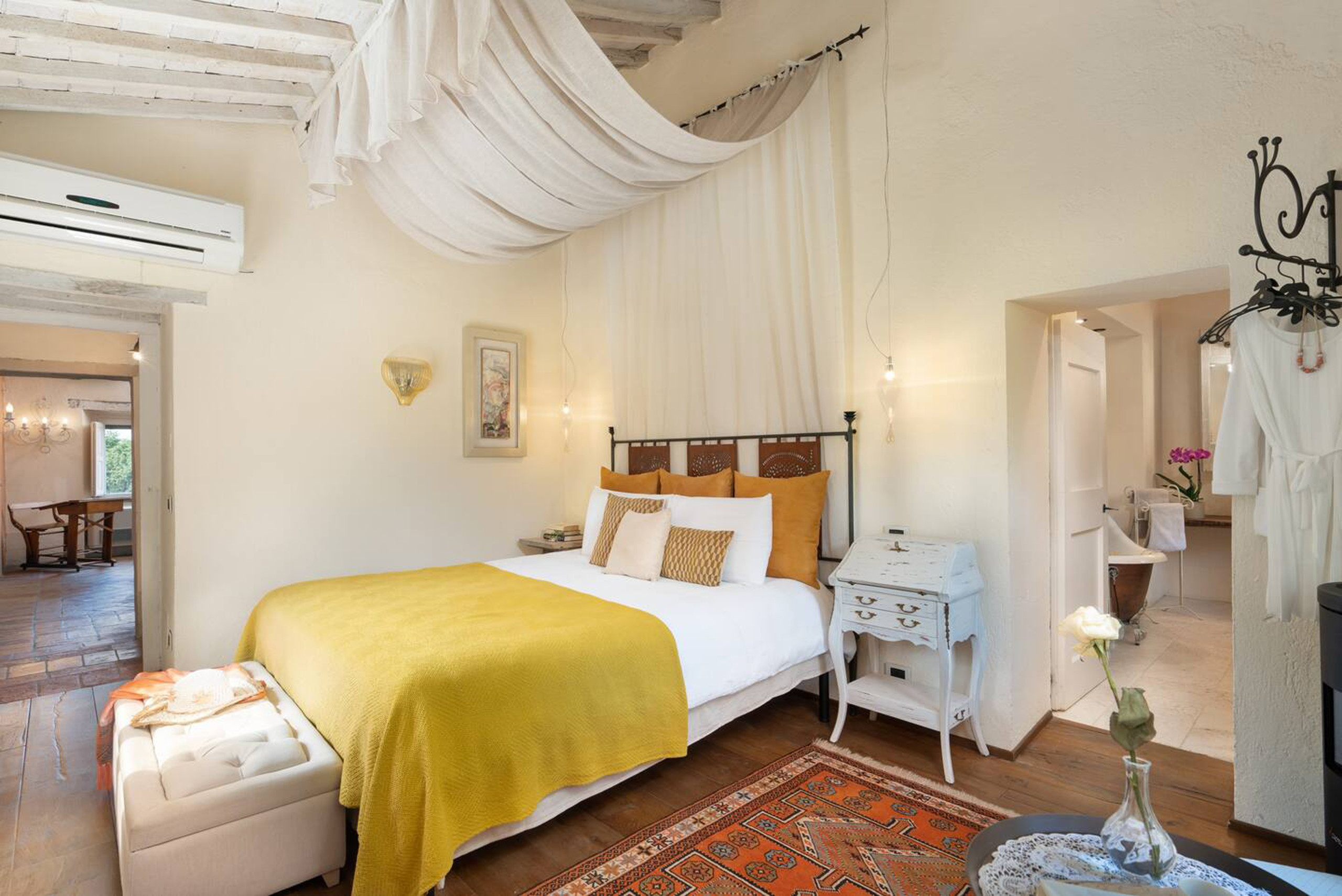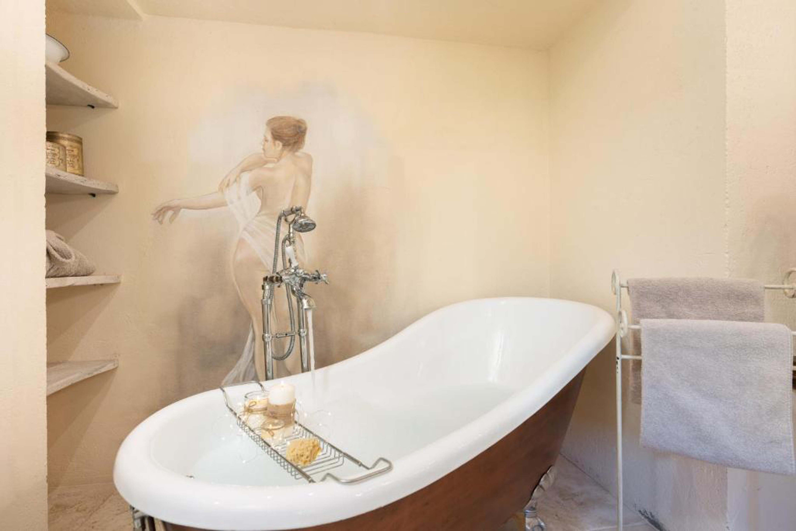 • Bedroom 1: King-size bed and en-suite bathroom with copper bathtub and travertine shower. Equipped with AC and heating