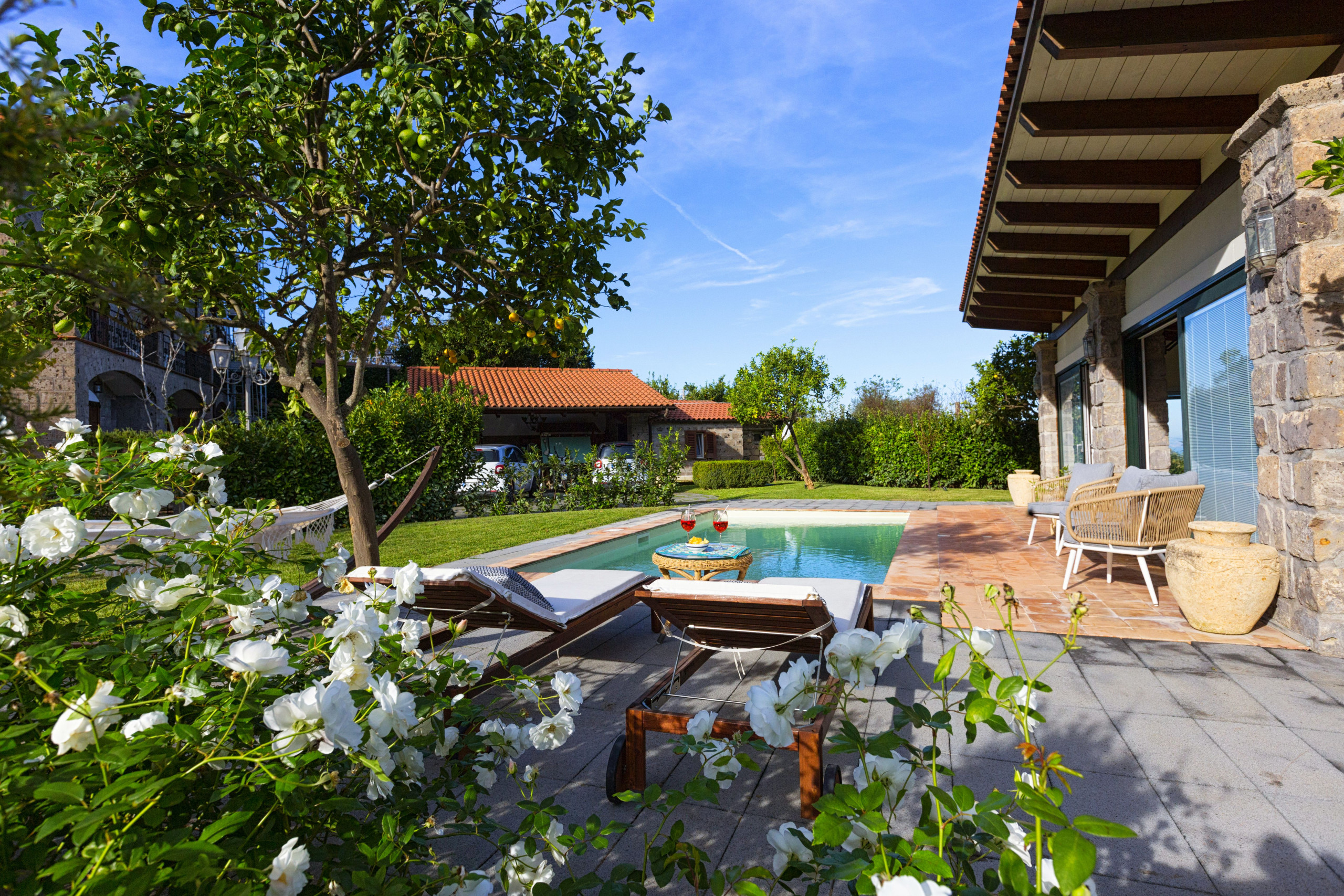 The private garden, carefully landscaped and rich in Mediterranean plants, features the private swimming pool (7 x 3.5 m, 1.30 m deep), open from April 1st to October 31st, and equipped with: